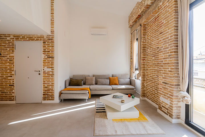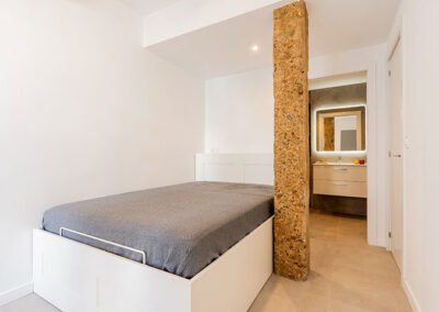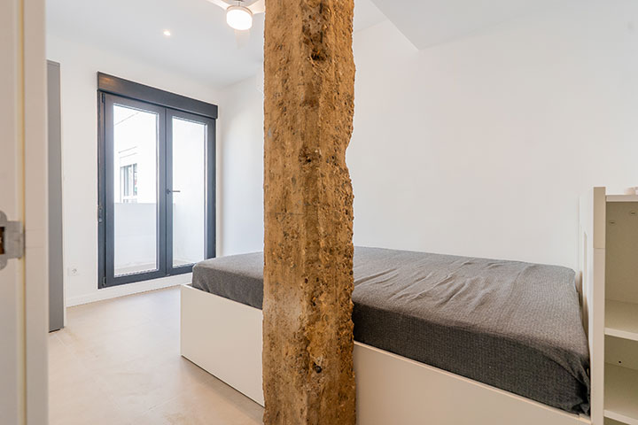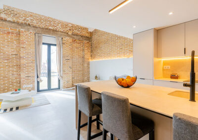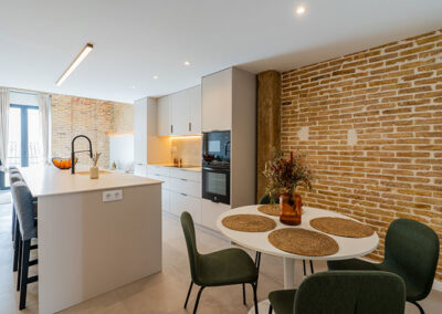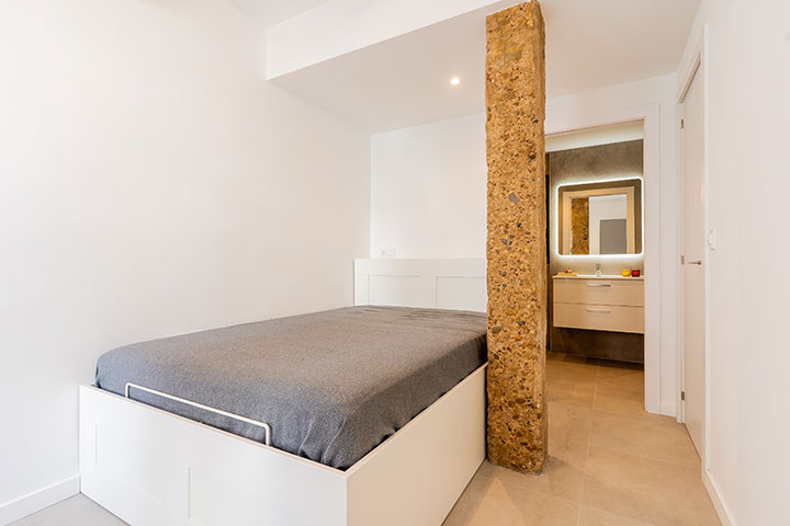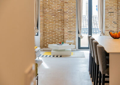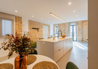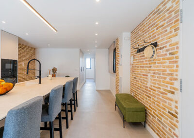 Se opta por unas líneas muy básicas y puras para dialogar con el mantenimiento de los elementos de estructura existentes, paredes de carga y pilares de barro macizo. Y se complementa con un mobiliario colorista que le otorga personalidad propia a la vivienda.
