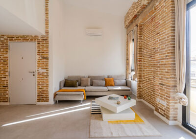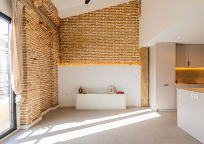 Este proyecto surge del deseo de los propietarios de generar un gran espacio común en la zona de la vivienda que da a la calle para las funciones de día, aprovechando que se trata de un último piso con una orientación sur, donde la luz exterior es un valor seguro. Se utiliza un juego de alturas de techo para separar las distintas funciones. Mientras las zonas más privativas se ubican en la parte interior del edificio donde el ambiente exterior es mas tranquilo y la luz de norte les proporciona más neutralidad.